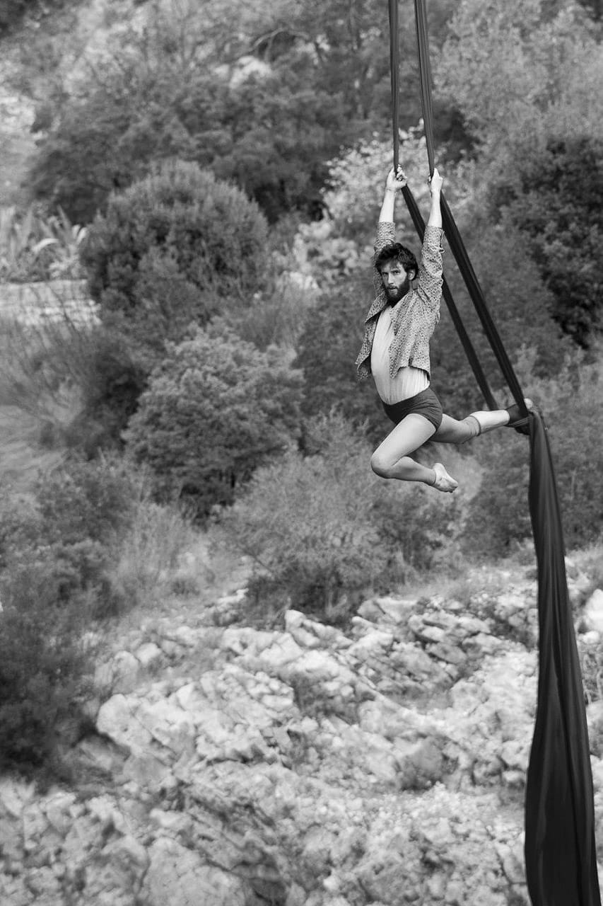 Je suis un artiste acrobate aérien. La soie est ma maison et j’aime m’accrocher aux arbres, aux ponts, ou à ma structure professionnelle.